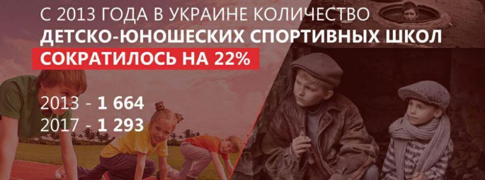 С 2013 по 2017 в Украине стало на 22% детско-юношеских спортивных школ меньше. В 2013 их было 1 664, в 2017 осталось 1 293 и сокращение продолжается.
